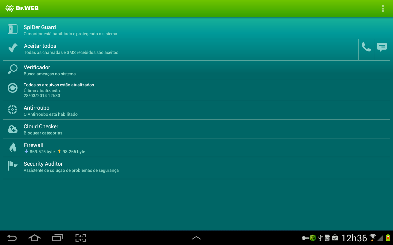 Usuários do Dr.Web Security Space ou do Antivírus Dr.Web podem usar o Dr.Web para Android (proteção abrangente) SEM CUSTOS ADICIONAIS.